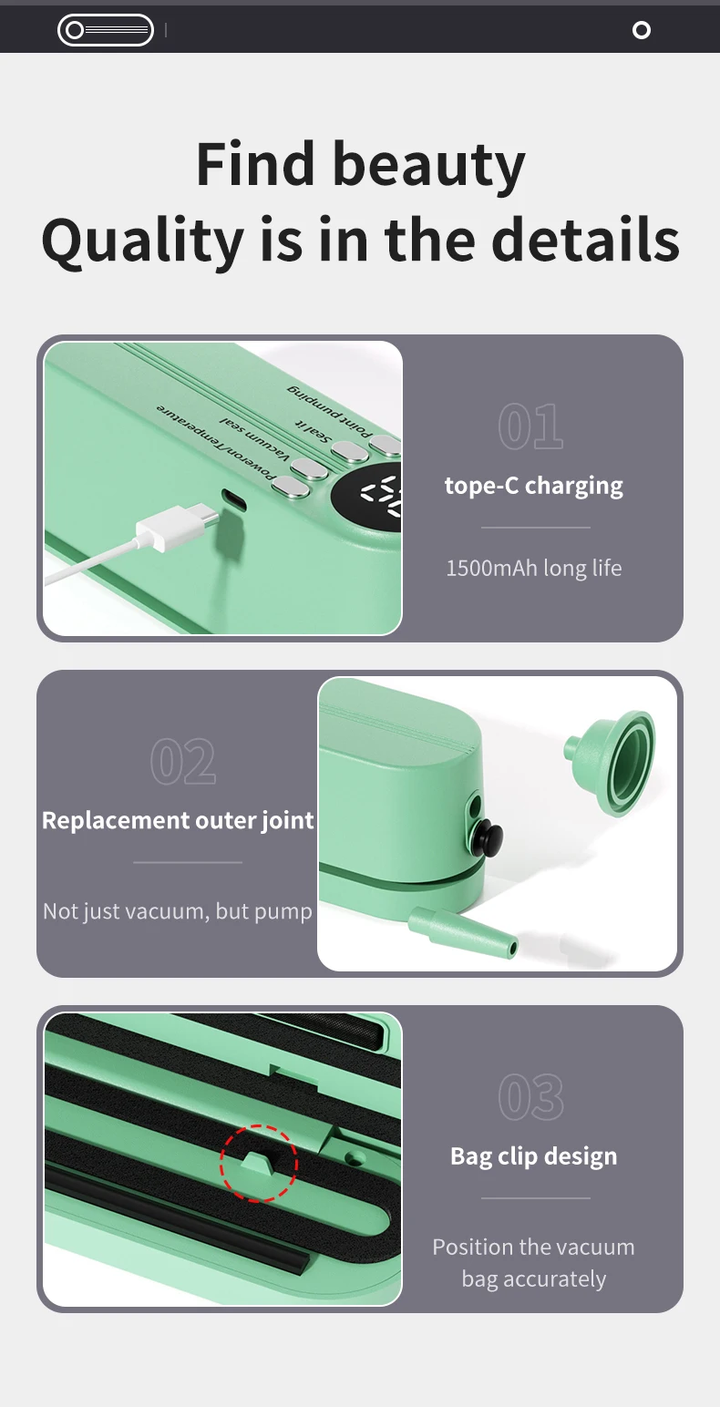 Type:Stand/Table Power Source:Battery Sealing Length:12.5cm Charging Method:Type-C Material:ABS Color:Beige,Green Size:16.4x4.3x5.6cm Type:Vacuum Sealer ..